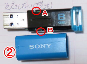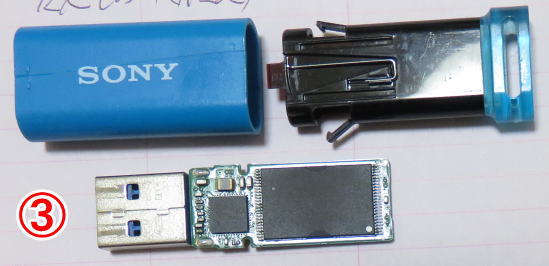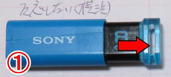 SONYのUSBメモリのケースは①写真で示している矢印の部分を強く引くと外側のケースが取れますが、かなりの力で引かなければ外れません