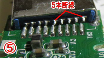 3の写真の赤い枠で囲っている部分は、コネクタに強い力がかかるとこの部分の端子の半田が外れて浮き上がります。この曲がった状態ではパソコンから認識されません