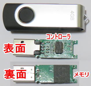下の写真はケースから中の基板を取り出した状態です。このUSBメモリの表面と裏面を見ると、通常だとコントローラとUSBメモリがついています。